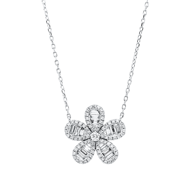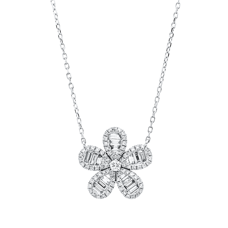 Entdecken Sie das exquisite Collier aus feinstem 18 kt Weißgold, das mit einer eleganten Länge von 45,7 cm und einem feinen Gewicht von 2,51 g perfekt um Ihren Hals schmiegt. Dieses Meisterwerk vereint 15 Baguette-Diamanten mit einem Gesamtgewicht von 0,32 ct und 76 funkelnde Brillanten von 0,23 ct, die in einer harmonischen Anordnung erstrahlen. Die Diamant-Farbe TW und die Reinheit si garantieren, dass jeder Stein in seinem Glanz erstrahlt und Ihre Schönheit unterstreicht.