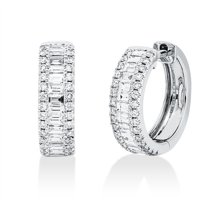 Entdecken Sie die zeitlose Eleganz der Creolen aus 18 kt Weißgold, die mit 28 funkelnden Baguette-Diamanten (0,62 ct, TW-si) und 60 strahlenden Brillanten (0,29 ct, TW-si) veredelt sind. Diese exquisiten Ohrringe haben einen Durchmesser von 14,4 mm und eine Breite von 15,1 mm, was ihnen eine perfekte Proportion verleiht. Mit einem Gesamtgewicht von 3,79 g sind sie nicht nur leicht, sondern auch äußerst bequem zu tragen und verleihen jedem Outfit einen Hauch von Glamour.