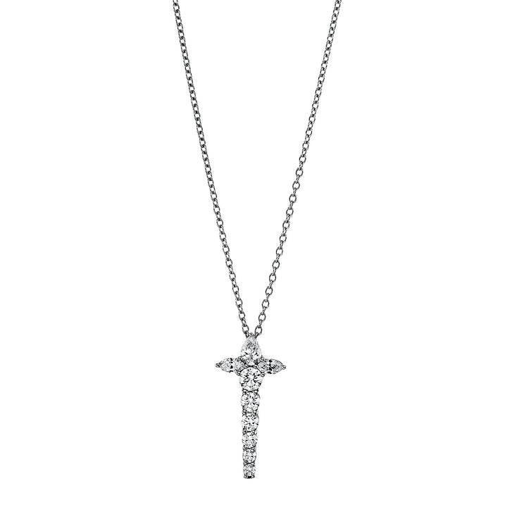 Dieses Collier spielt mit der Form des Kreuzes – aber bricht mit allem, was du über klassischen Schmuck denkst. 9 Diamanten im Fantasie-Schliff, insgesamt 0,80 ct (TW-vsi/si), treffen auf 18 Karat strahlendes Weißgold. Mit 22,5 mm Länge und 42 cm Kettenmaß liegt dieses Piece genau da, wo Haltung beginnt: bei dir.