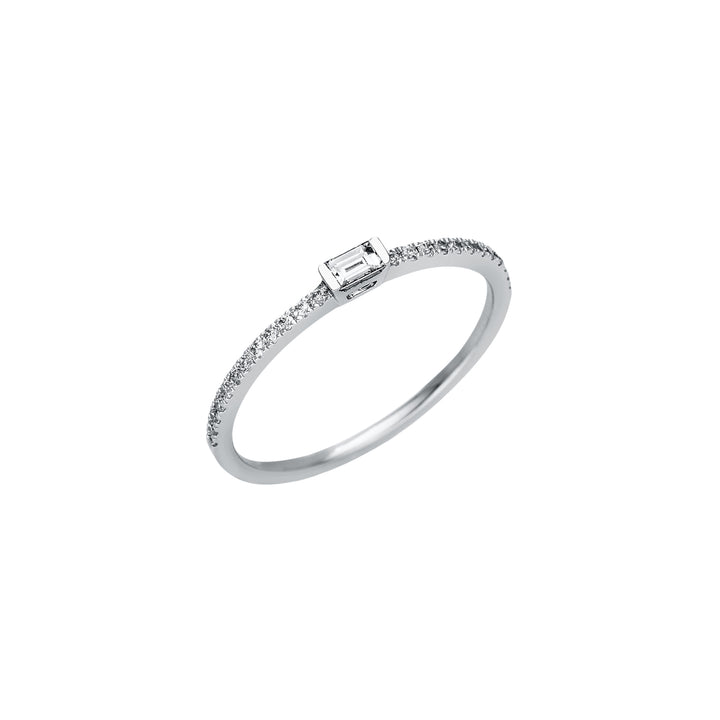 Klassisch, aber alles andere als langweilig – dieser Ring bringt einen Solitär im Baguette-Schliff (0,06 ct, TW-VSI/SI) aufs nächste Level. Umrahmt von feinen Brillanten (0,11 ct, TW-VSI/SI) entsteht ein Look, der solo stark wirkt und sich gleichzeitig perfekt stacken lässt. Gefertigt in 18 Karat Weißgold oder Gelbgold, wird dieses Piece zum stilvollen Alltagsbegleiter mit Understatement.