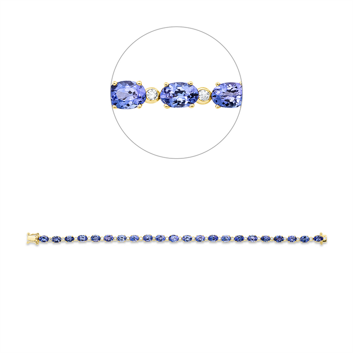 Entdecken Sie das faszinierende Armband aus 14 kt Gelbgold, das nicht nur durch seine edlen Materialien, sondern auch durch seine exquisite Verarbeitung besticht. Mit einer Länge von 17,8 cm und einer Breite von 4,5 mm umschmeichelt es zart Ihr Handgelenk. Funkelnde 22 Brillanten mit einem Gesamtgewicht von 0,48 ct in der Farbe TW und Reinheit si verleihen dem Schmuckstück einen atemberaubenden Glanz, während die 22 Tansanite in einem strahlenden Blau mit insgesamt 10,70 ct das Design perfekt abrunden.