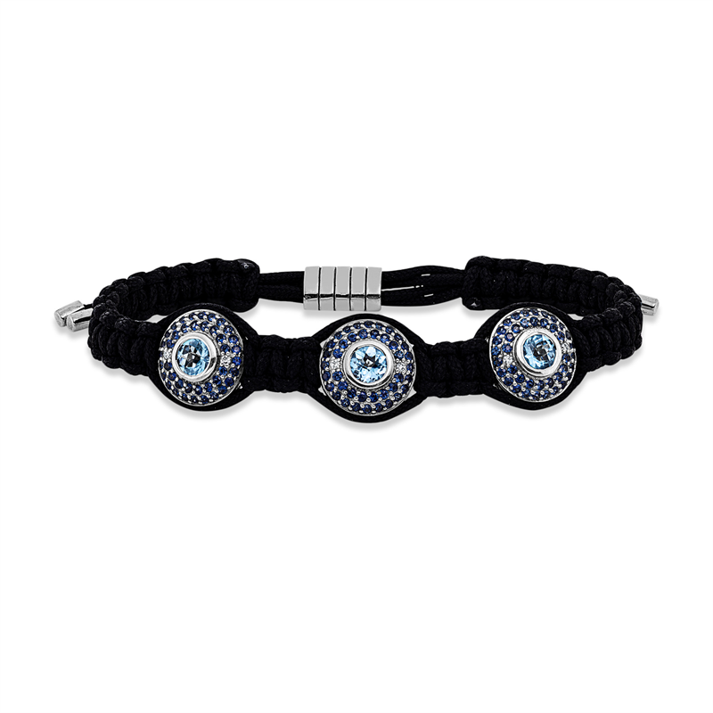 Entdecken Sie das exquisite Armband aus 18 kt Rotgold, das mit einer eleganten Kombination aus schwarzem Cord und funkelnden Steinen verzaubert. Sechs brillante Diamanten mit einer Gesamtcaratur von 0,06 ct strahlen in der Farbe I und Reinheit vsi, während drei atemberaubende Topase in einem tiefen Blau das Gesamtbild abrunden. Mit einem Gesamtgewicht von 10,05 g und 120 funkelnden Saphiren (1,38 ct) ist dieses Schmuckstück ein Must-Have für jede stilbewusste Frau.
