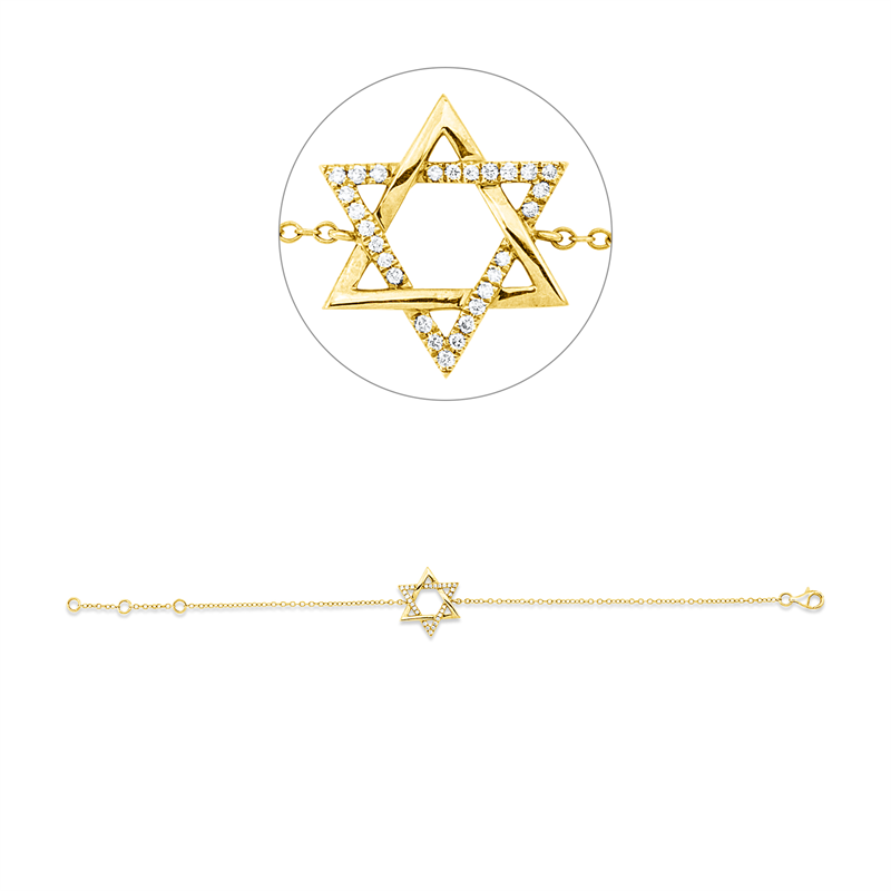 Entdecken Sie das exquisite Armband aus 14 kt Gelbgold, das mit einem funkelnden Davidstern verziert ist. Dieses kunstvoll gestaltete Schmuckstück ist nicht nur ein atemberaubendes Accessoire, sondern auch ein Symbol für Glauben und Tradition. Mit einer Länge von 17,5 cm passt es perfekt an jedes Handgelenk und verleiht Ihrem Look einen Hauch von Eleganz. Die 27 Brillanten mit einem Gesamtgewicht von 0,12 ct erstrahlen in der höchsten Qualität (W-si/pi) und setzen glanzvolle Akzente, die alle Blicke auf sich ziehen.