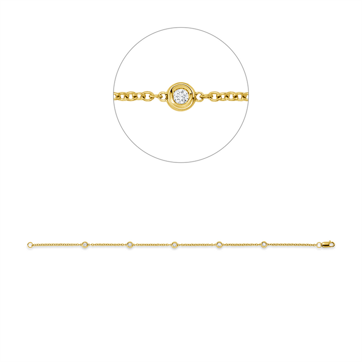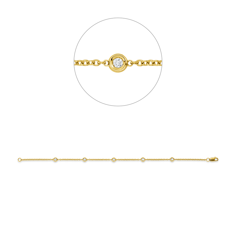 Entdecken Sie das exquisite Armband aus 18 kt Gelbgold, das nicht nur Ihr Handgelenk schmückt, sondern auch Ihre Persönlichkeit unterstreicht. Mit einer Breite von 3,8 mm und einer Länge von 17,8 cm passt es perfekt zu jedem Anlass. Fünf funkelnde Brillanten mit insgesamt 0,16 ct in der hochwertigen Farb- und Reinheitsklasse TW-si verleihen diesem Schmuckstück eine zeitlose Eleganz. Das filigrane Design und die edlen Materialien machen dieses Armband zu einem Must-Have für die moderne Frau.