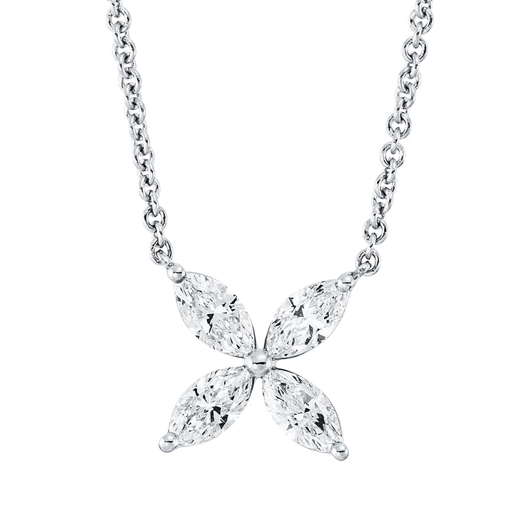 Dieses Collier sagt nicht viel – aber alles, was zählt. Vier Diamanten im Navette-Schliff, insgesamt 0,82 ct, TW-si, treffen auf 18 Karat strahlendes Weißgold. Auf 42 cm sitzt das Piece genau da, wo dein Selbstbewusstsein pulsiert. Nicht zu laut, nicht zu leise – einfach genau richtig.
