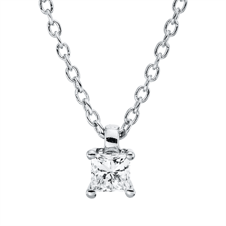 Entdecken Sie das exquisite Collier 4er-Krappe aus feinstem 18 kt Weißgold, das Eleganz und Klasse verkörpert. Mit einer Länge von 45 cm und einem strahlenden Princess-Diamanten von 0,10 ct, der in einer raffinierten 4er-Krappe gefasst ist, zieht dieses Schmuckstück alle Blicke auf sich. Die TW-si Qualität des Diamanten garantiert nicht nur einen funkelnden Glanz, sondern auch eine subtile Brillanz, die das Herz jeder Schmuckliebhaberin höherschlagen lässt.
